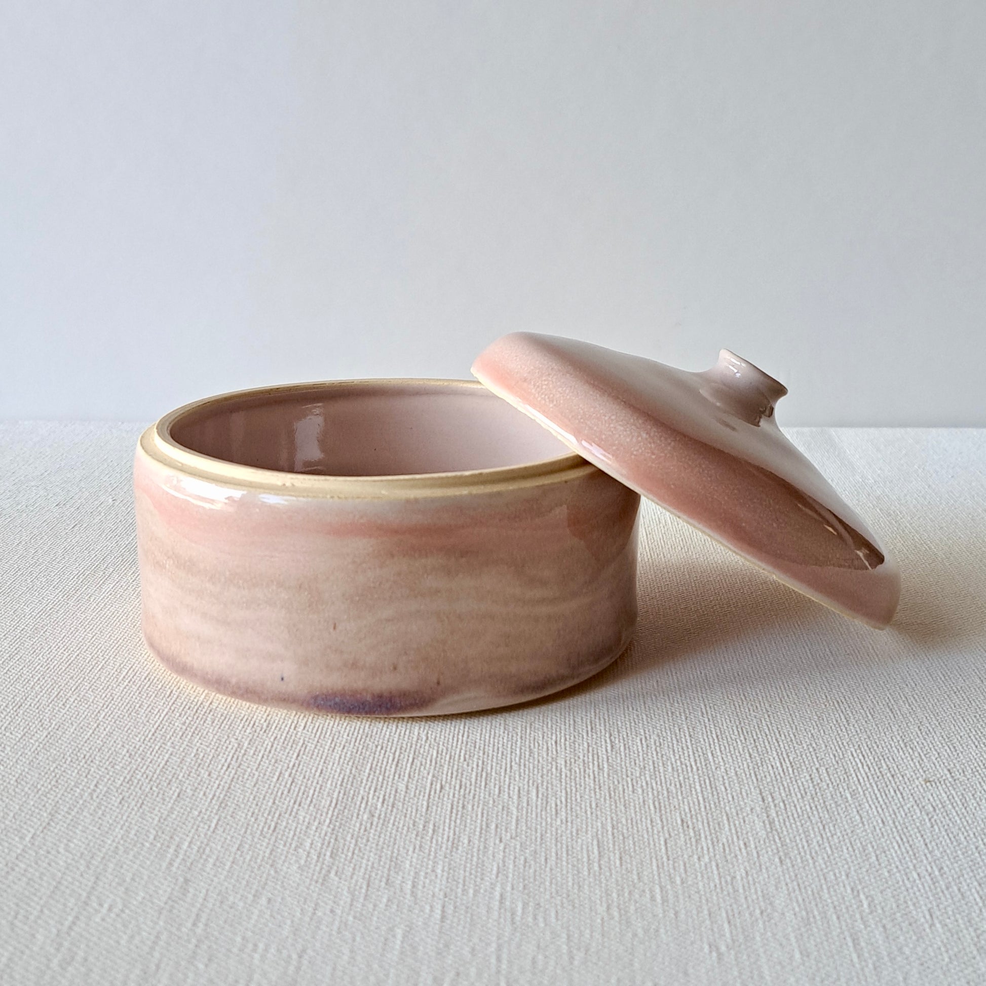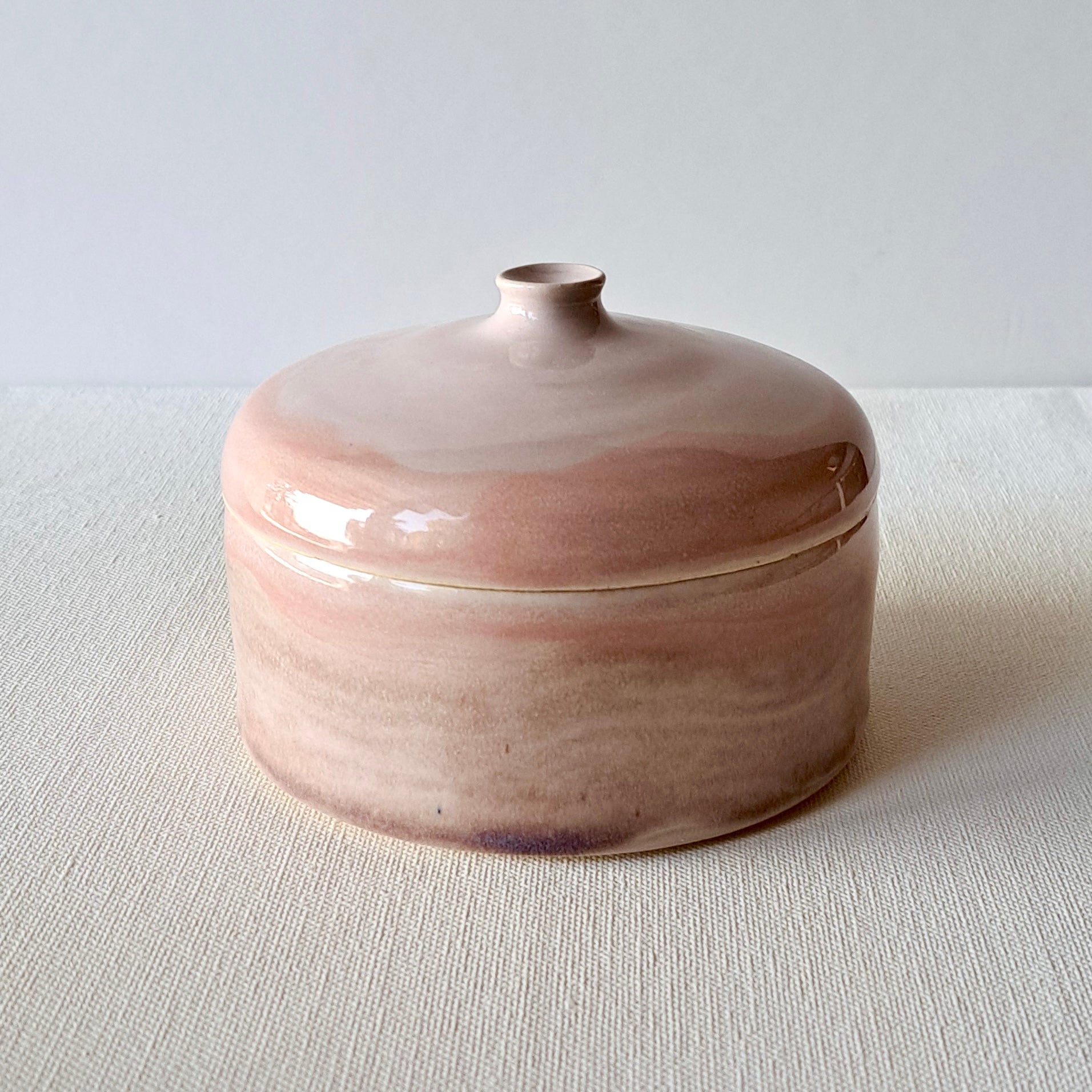 Handmade ceramic lidded box in medium size with soft, warm 'after sunset' colors. It can be used to store your jewelry or alternatively to hold and present chocolate or candy.