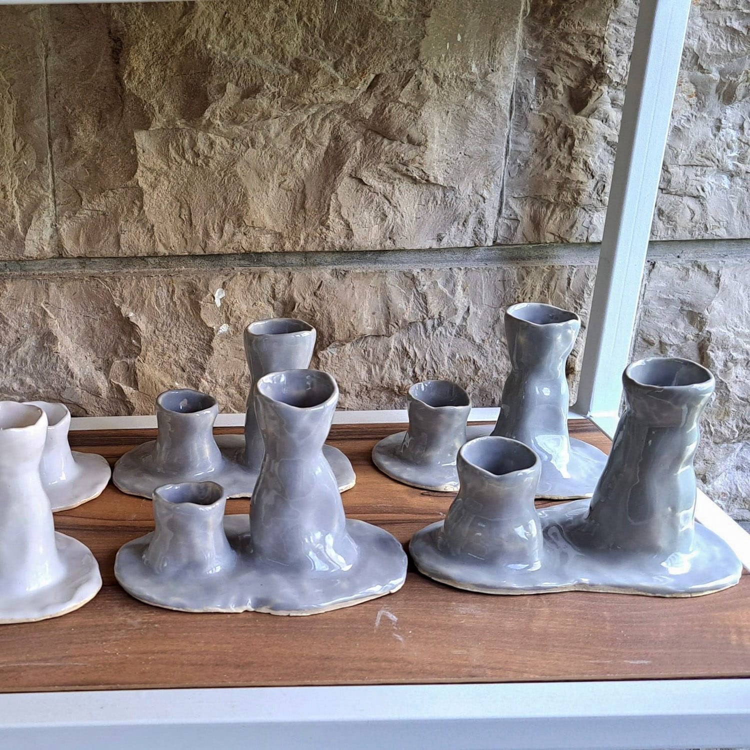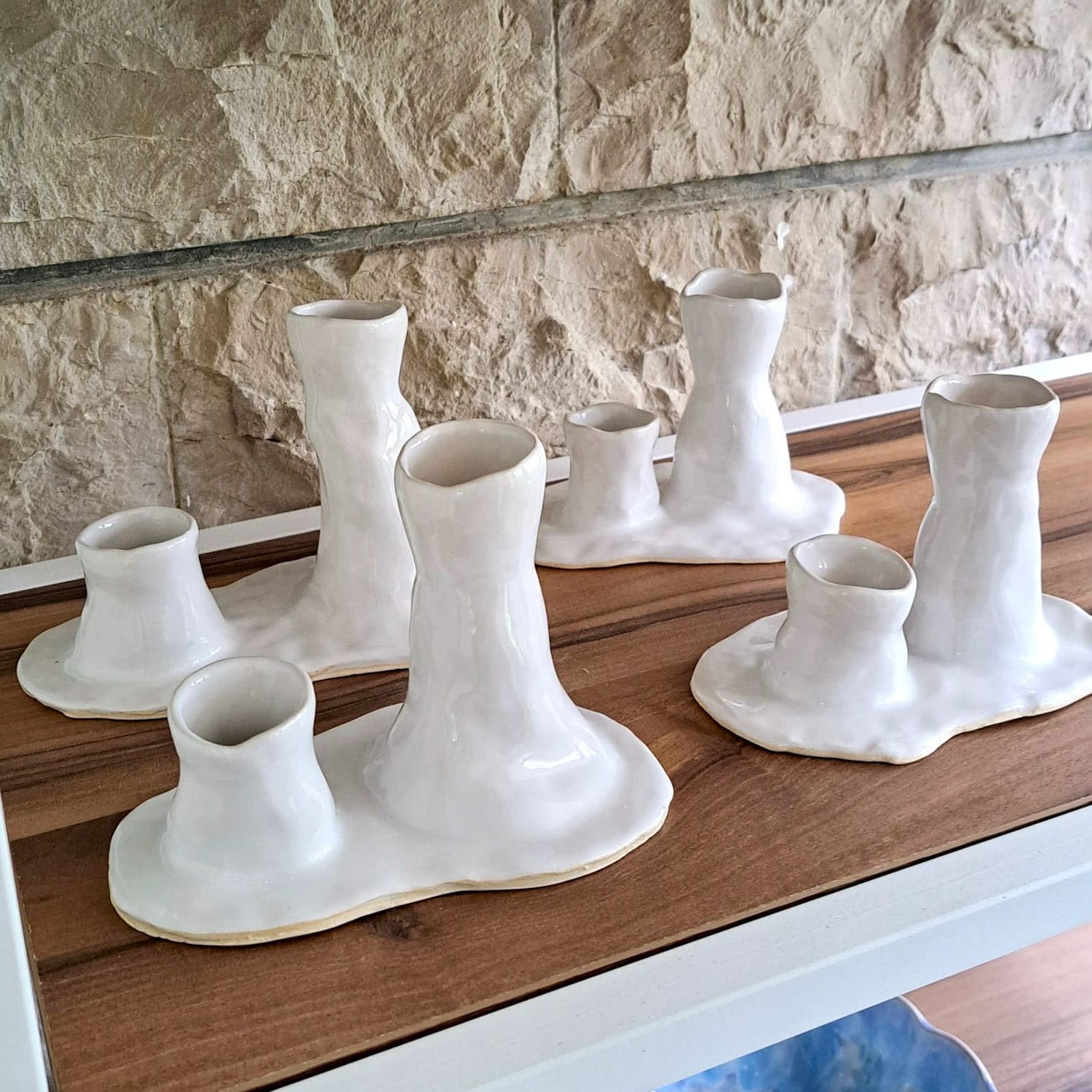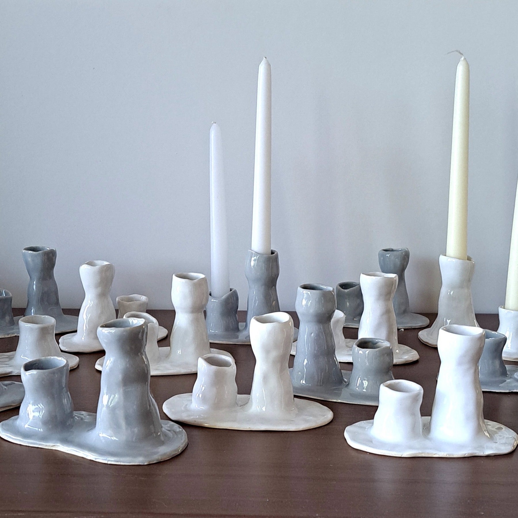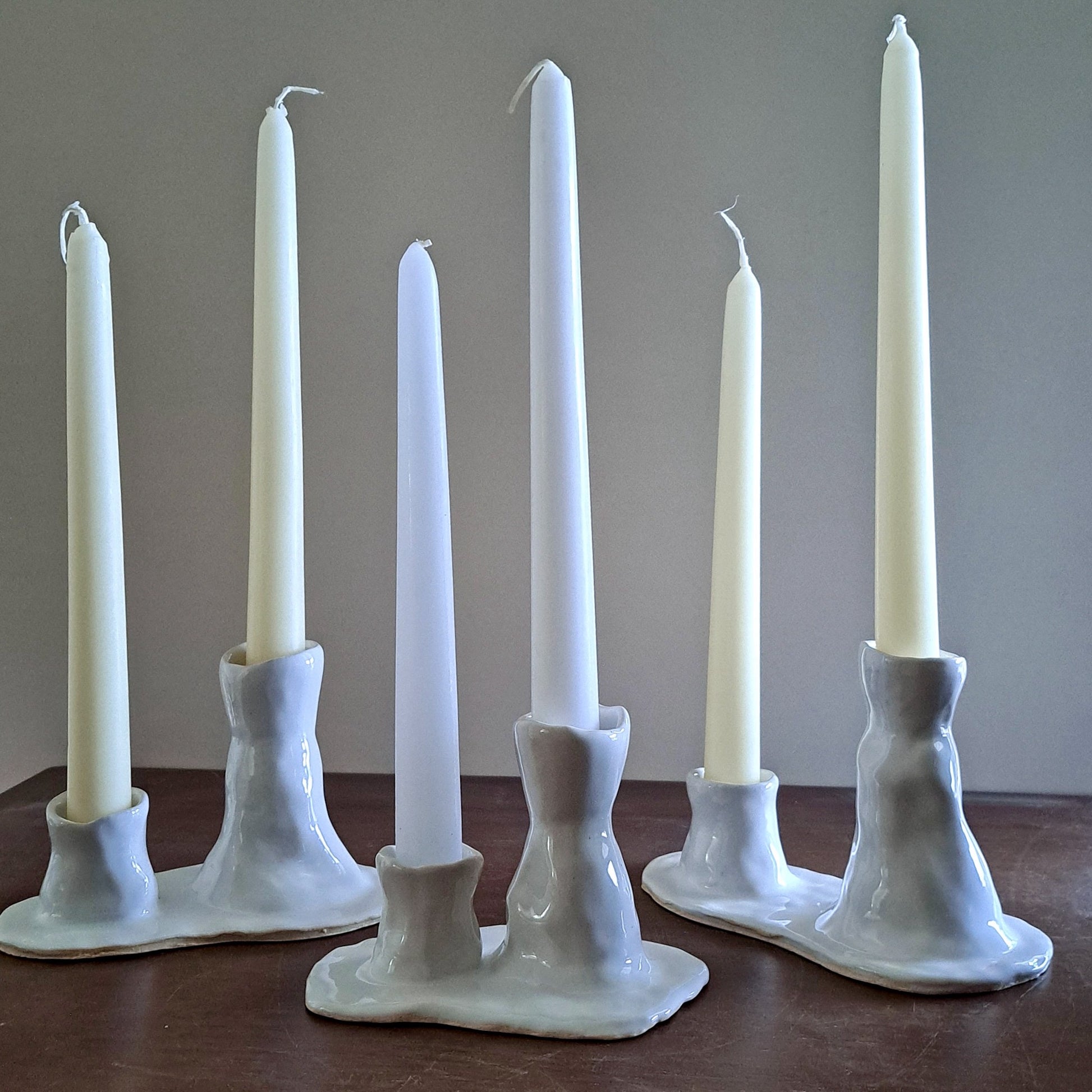 A unique pair of asymmetric candleholders on a single base embodying the flowy nature of melted wax. Available in two glaze options: grey and white.